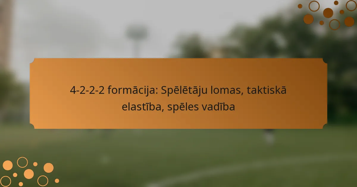4-2-2-2 formācija ir taktiska izkārtojuma shēma futbolā, kas līdzsvaro aizsardzības stabilitāti ar uzbrukuma potenciālu, ietverot četrus aizsargus, divus centrālos pussargus, divus uzbrūkošos pussargus un divus uzbrucējus. Šīs formācijas atslēga ir kustība bez bumbas, kas uzlabo plūstamību un rada iespējas, kamēr aizsardzības pienākumi uzsver komandas formas saglabāšanu un efektīvu komunikāciju, lai atvieglotu ātras pārejas starp uzbrukumu un aizsardzību.